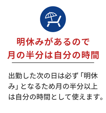 勤務日の翌日はお休みになるので、週の半分はお休み!