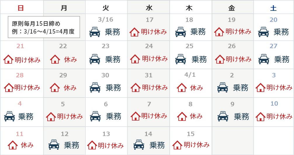 月11~13勤務/1乗務あたり実働14.5時間 |